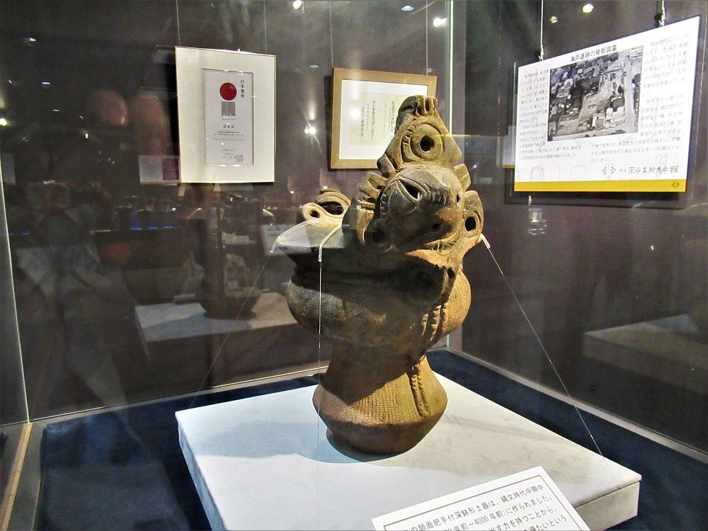 さて。岡谷美術考古館には「海戸(かいど)遺跡」で出土した「顔面把手付深鉢形土器」があります。顔面が外を向き、腰がしまっている形は非常に珍しく、国指定重要文化財に指定されています。併せてご覧ください。