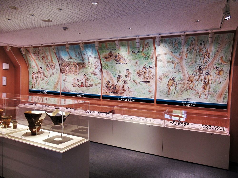 縄文時代の採掘イメージを、パノラマイラストにして展示したコーナーです。泊まりがけで黒曜石を採掘しに行った縄文人の姿が、わかりやすく描かれています。