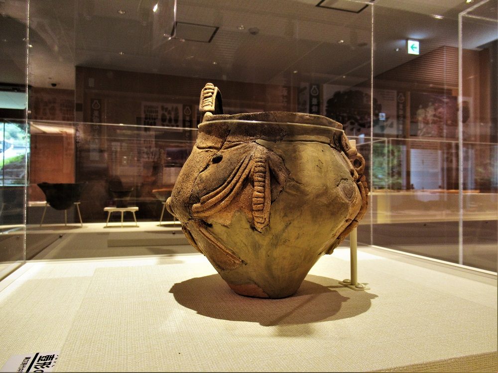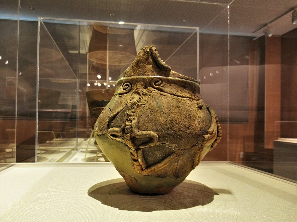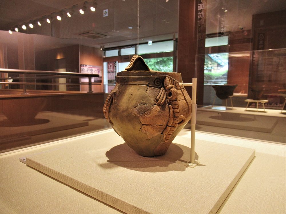 縄文時代中期(約5000年前)には珍しいという壺形土器。首が短い壺形も特徴的だといわれています。口縁部が三角形状に高まる突起の下には、人体または動物を表現したような痕跡が見られ、何か特別なシーンで使われていた可能性があるそうです。
