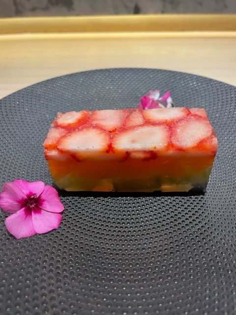 苺の断面が美しい寒天を使ったデザート(甘味)。斬新なデザインに見入ってしまいます。