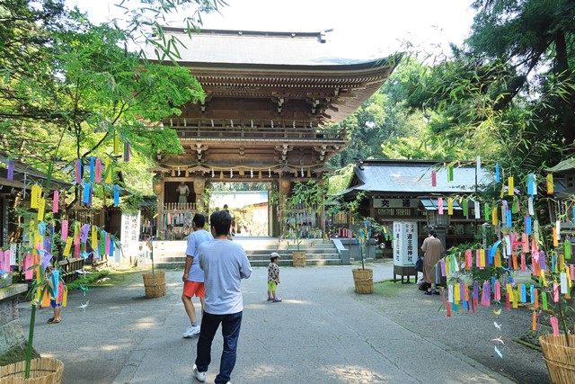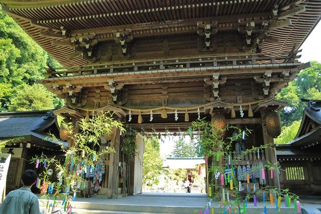 振り返って、七夕飾りと楼門の先に一之鳥居