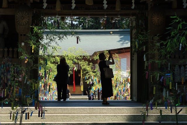 楼門の先、仮社殿へと続く参道にも七夕飾りが並んでいます。