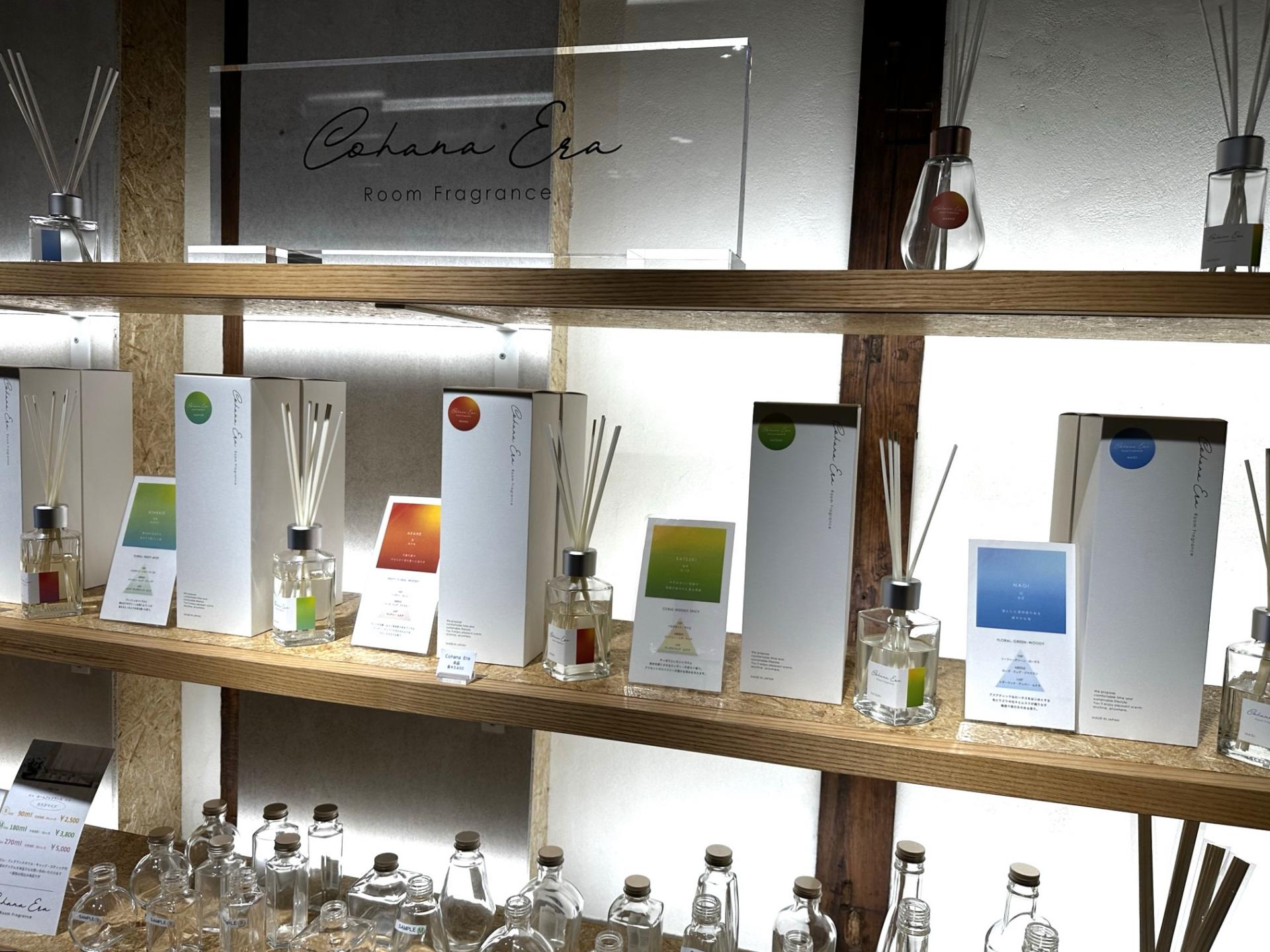 香りのブランド「コハナ・エラ」、どことなく郷愁を漂わせているガラス製ディフューザーには、懐かしい和をも感じさせる香りが詰まっています。またディフューザーは、販売されているお好みのガラス瓶や香りが選べ、カスタマイズできます。