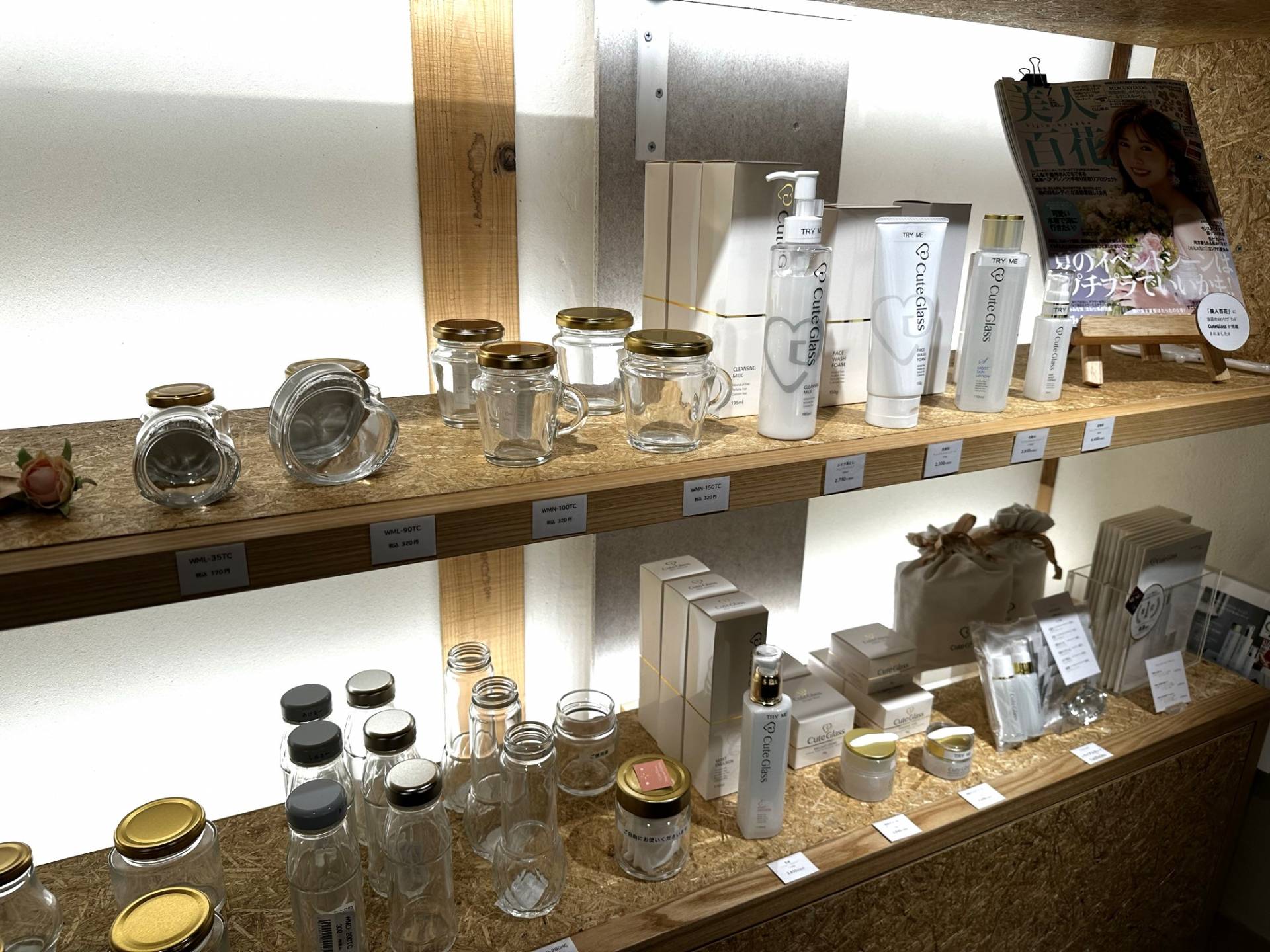 化粧品の容器は、日本精工硝子(株)が、ガラス瓶メーカーとして約50年前に参入して以来の主力商品だそう。ハート型の容器など、お洒落で洗練されたデザインの容器に入った化粧品が並んでいます。