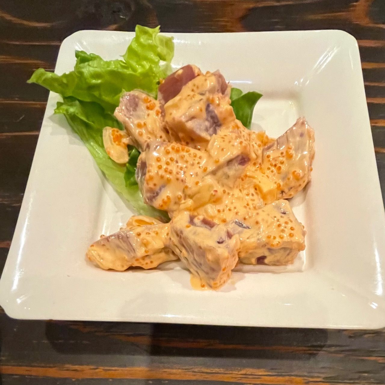 アヒポキ(マグロ・トビッコのハワイ風マヨネーズの和え物) ハワイ語でマグロの切り身の料理という意味。初めて頂いたけど、意外とお酒のおつまみに合いますね。