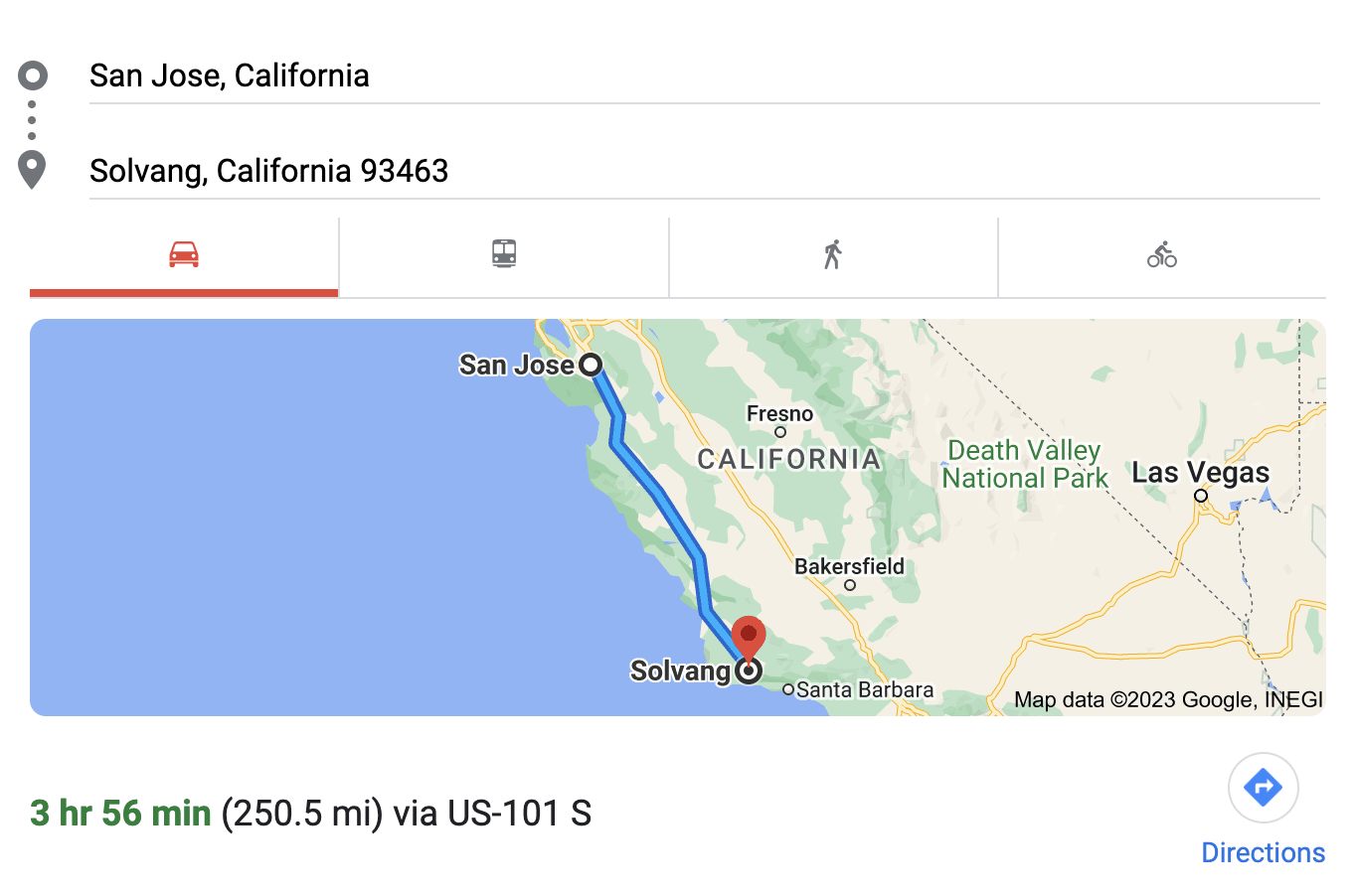 休憩を挟まずにひたすら走り続ければ4時間ほど、とGoogle Mapは示します。しかし、南下の道中、パソ・ロブロスやサン・ルイス・オビスポ、ピズモビーチ等の観光都市を通り、ワイナリーやオリーブ・ランチ(オリーブ・オイル農場)に寄れる機会もたくさんあります。サンノゼからなら、観光や休憩を挟みながら、ソルバンで一泊か、ソルバンに着く前に途中で一泊するつもりで、二泊三日くらいでのんびりと出かけるのもいいのではないでしょうか。