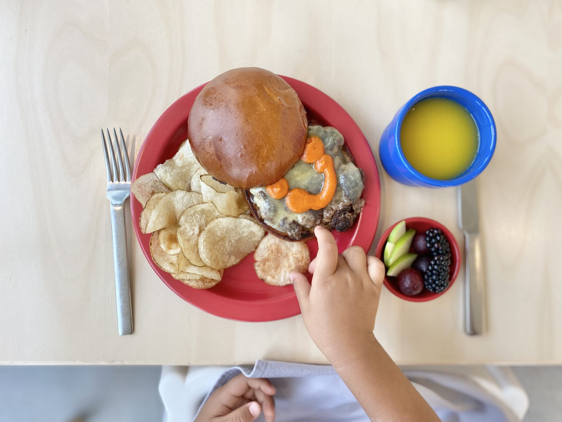 テイブルではキッズメニューも充実していて、キッズバーガーは大人も食べたくなるような豪華なお子様セット。鮮やかな色使いやチャーミングなデコレーションは子ども心をくすぐります。こちらの自家製ポテトチップスにはアブダビ産のじゃがいもを使われています。
