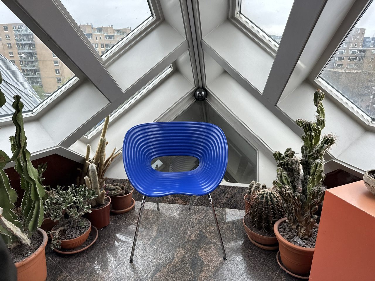 1階にはキッチンと浴室が、2階には寝室と書斎があり、3階はリビングとなっています。最上階にあるこの青いイスに座って写真を撮るために、皆順番待ちをしていました。