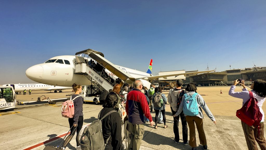 今回南アフリカで経験したのは、小型機(A320など)の搭乗で、後部の席の人は後ろのタラップからの乗車でした。