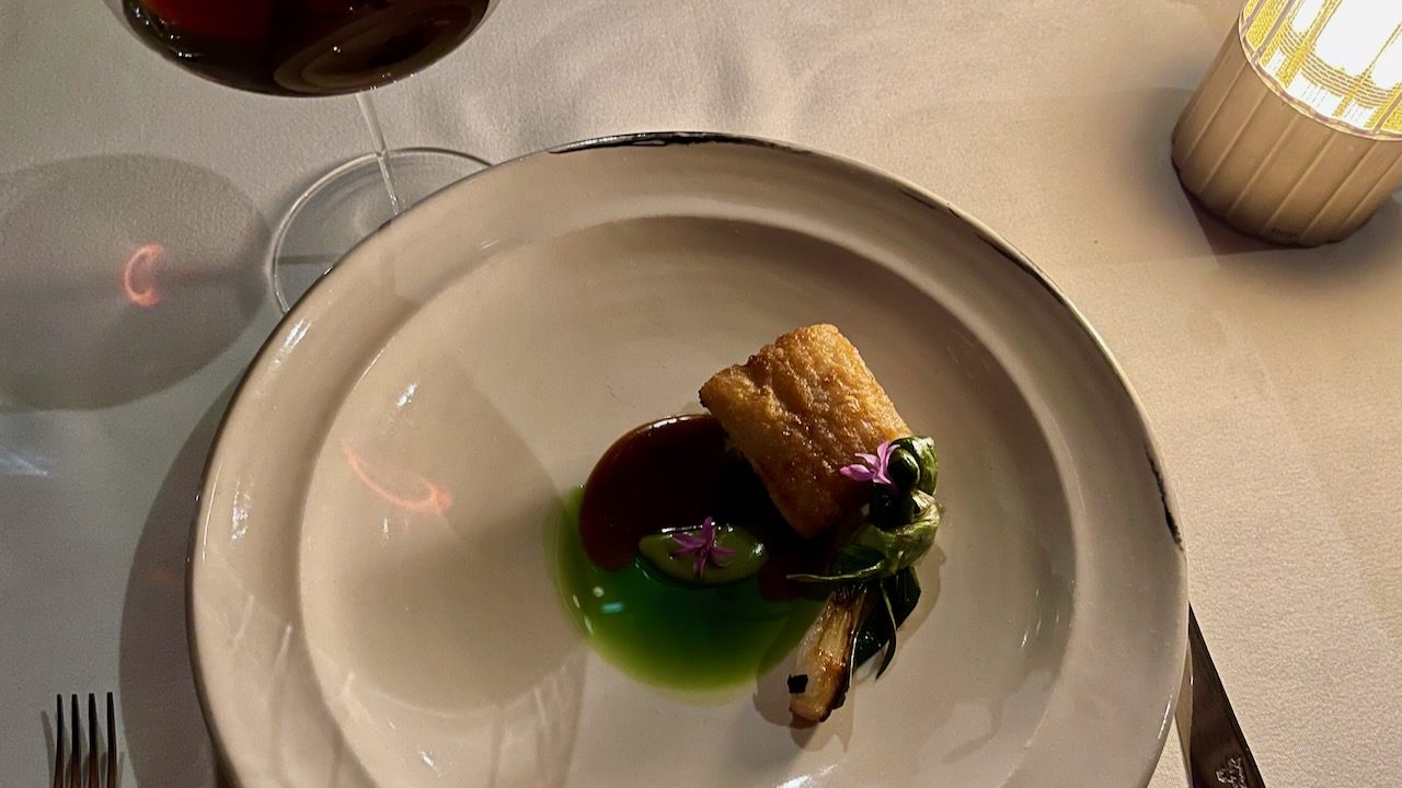 登場したのが、見事に外れて、ワインソース系と白っぽいお魚。「エイのグリル」だったのですが、このお魚は、バターソースと合わせることが多いですが、ワインソースが身の間に軽く染み込んでて、なるほど驚きました。エイの適度な噛み応えが自然をいただいてる感じがしました。