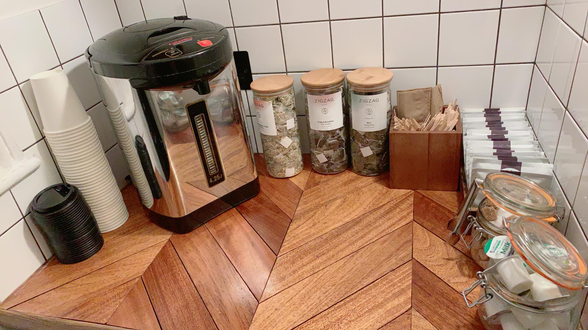 部屋の近くにはパントリーが用意されていて、コーヒーや紅茶が飲み放題です。