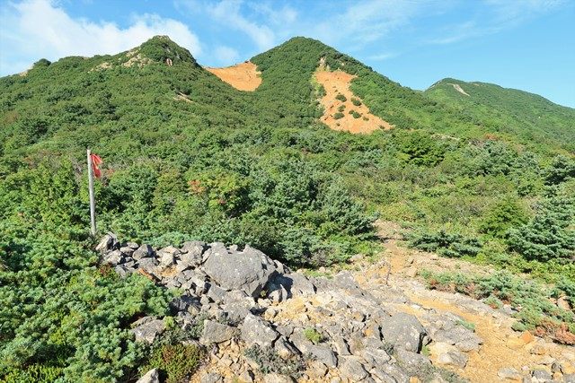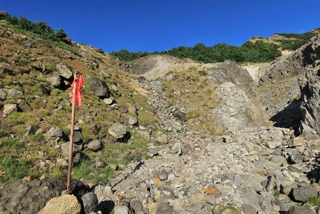 駱駝山との鞍部へ戻り、不動沢ルートとの合流ポイントへと回り込みます。シモフリ新道の稜線ではなく、こちらが現在のメインルートとなります。画像は、不動沢ルートと合流ポイントです。