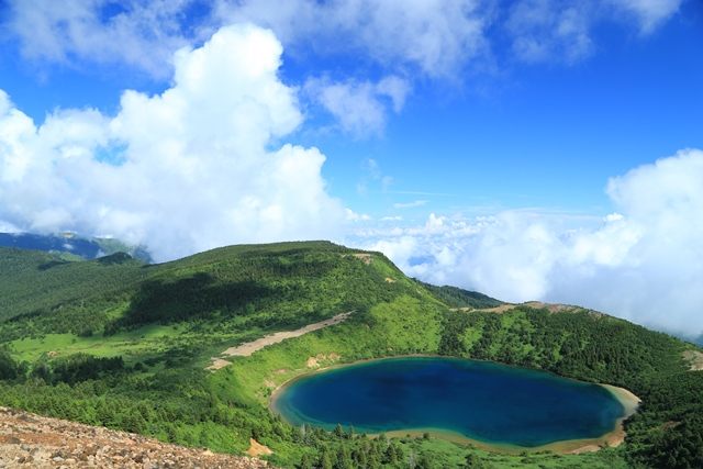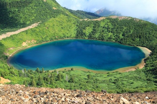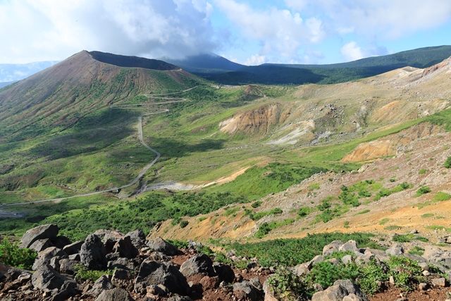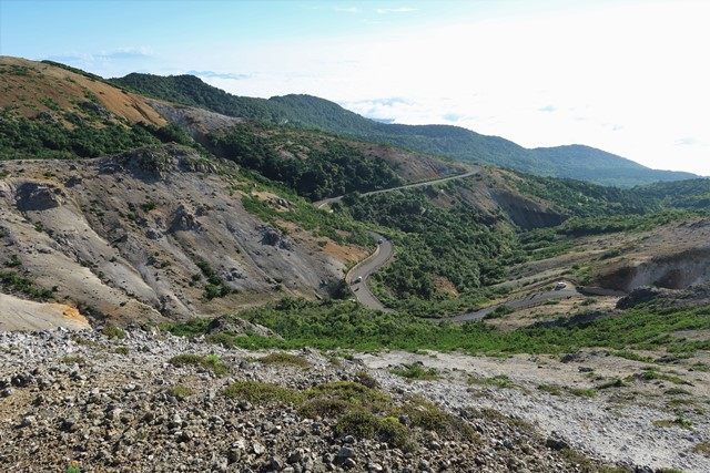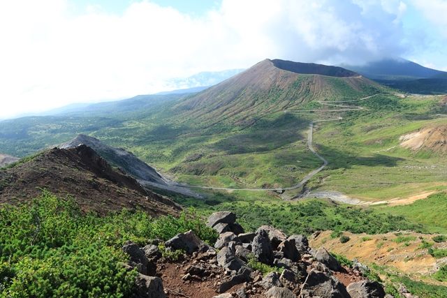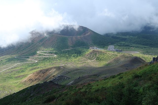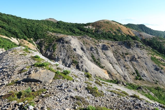 一切経山南東側の荒涼とした旧火口周辺と涅槃坂(ねはんざか)を眼下に。