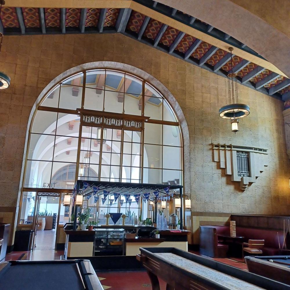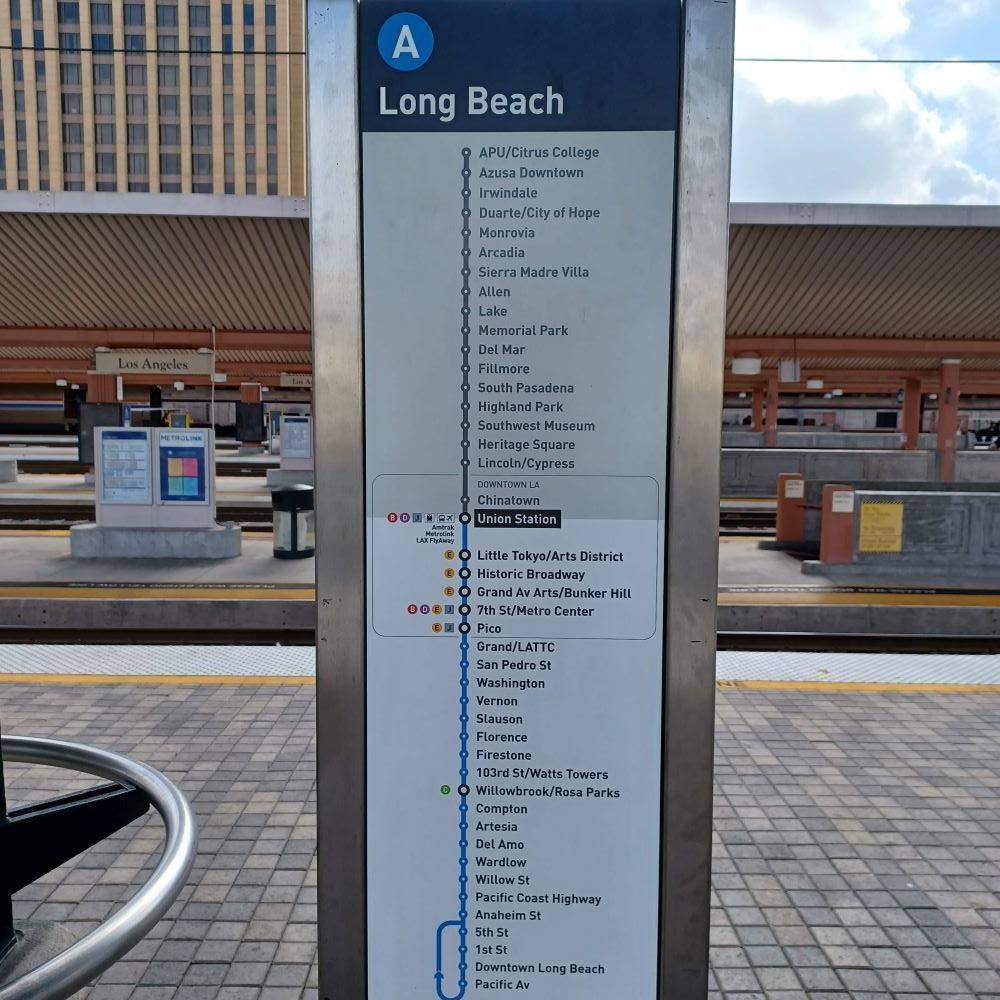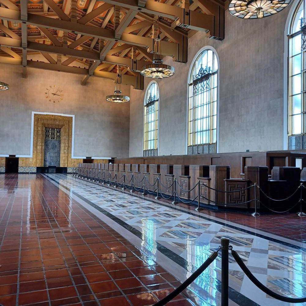 今回の旅の始まりはロサンゼルス国際空港(LAX)からです。東京・羽田発のアメリカン航空でLAX空港のBターミナルには現地時間の早朝6時に到着しました。ターミナルが全部で9つ(ターミナル1~8、国際線用ターミナルB)もある大きな空港ですが、LAX FlyAwayというバス路線が各ターミナル(計8か所)の到着階から約30分ごとに出ています。(柱に青色の看板がある所が乗車口の目印) 空港内では各ターミナルの乗車口で乗客を拾ってくれます。ユニオン駅までおよそ30~40分で乗り換えなしで移動できます。車内も清潔で快適でした。