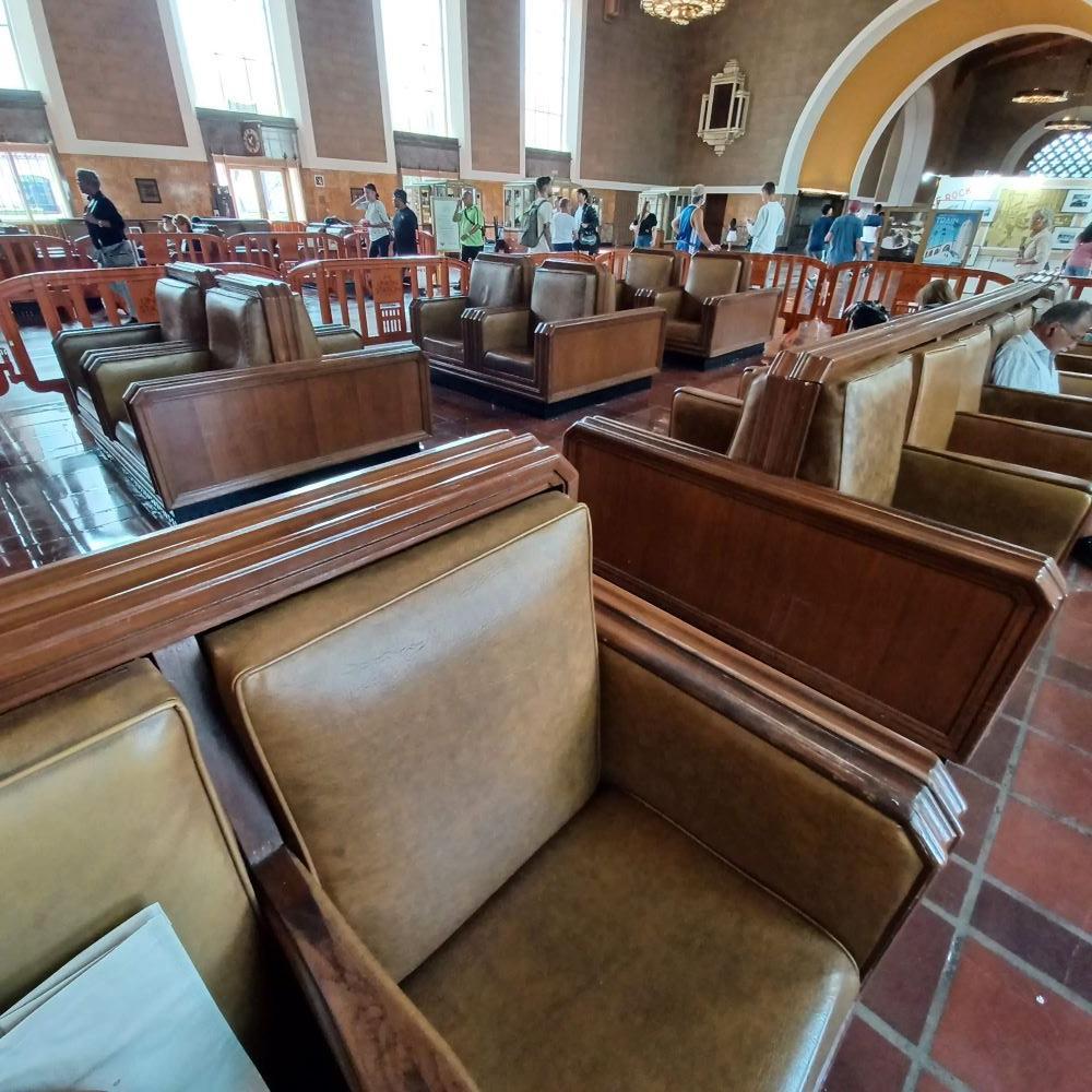 旅客用の待合ベンチはアムトラックの当日の乗車券を持っていれば利用できるということで、セキュリティ(待合ベンチの周囲を柵で囲み、チケットが無いと利用できないようチェックしている)にチケットを見せてエリアに入りました。看板には「発車時刻の2時間前から利用可」と書いてありましたが、事情を説明したら数時間早くても入れてもらえました。待合ベンチは一人がけの革張りの大きな椅子で、駅舎のレトロな雰囲気とよく似あいます。ただし電源やUSBポートなどの設備はありません。待合エリアからは列車の出発案内の電光掲示板が見えますが、発車時刻の2時間前にならないと掲示されないので、掲示板だけでなく館内放送にも気を付ける必要があります。