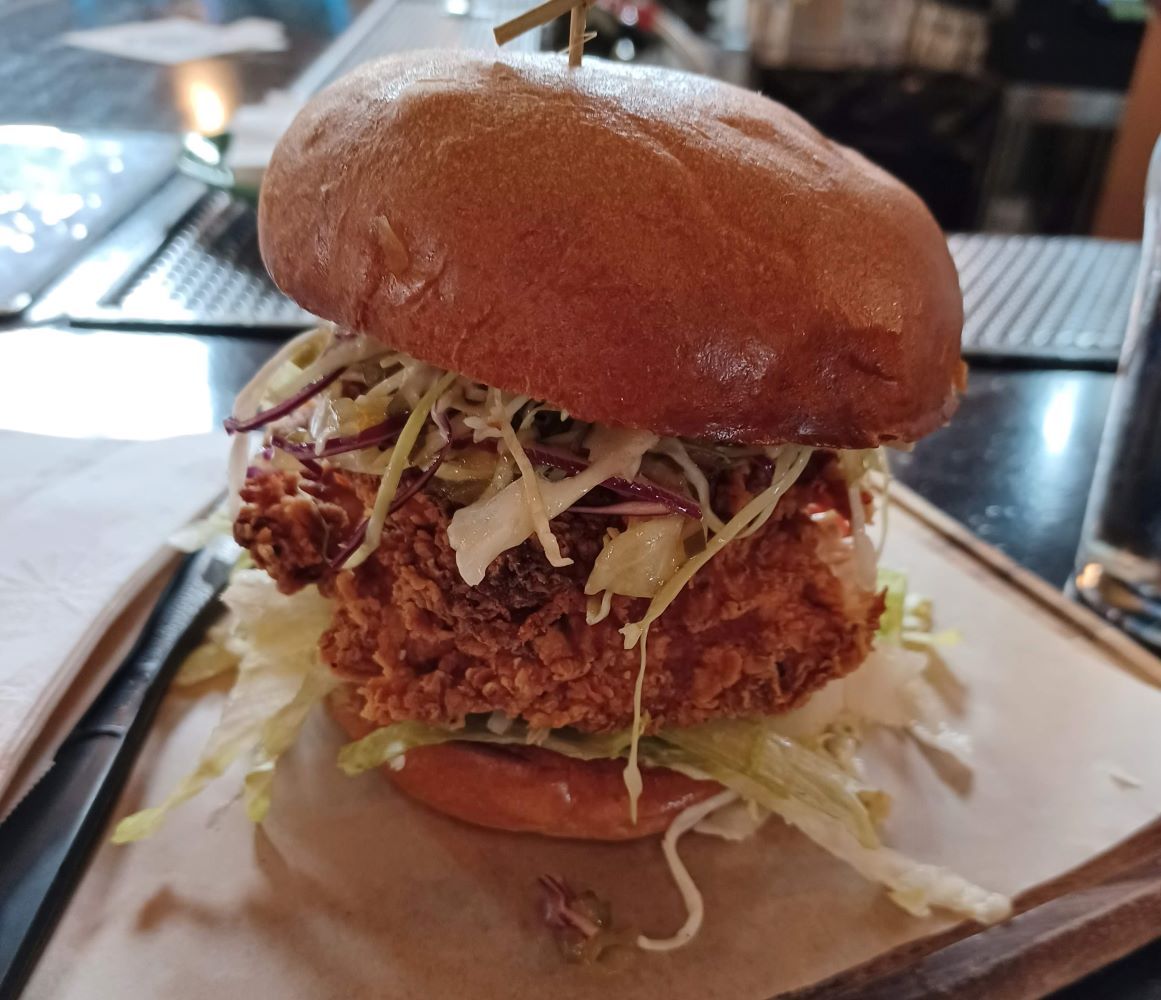 再びユニオン駅に戻りましたがまだお昼時、次は駅構内で座って食べられるお店を探してみました。多くの店はテイクアウト専門で店内にテーブルが無かったので、正面口近くにあるスポーツバー「ホームバウンド・ブリューハウスHomebound Brew Haus」を見つけここでチキンサンドをオーダーしました。