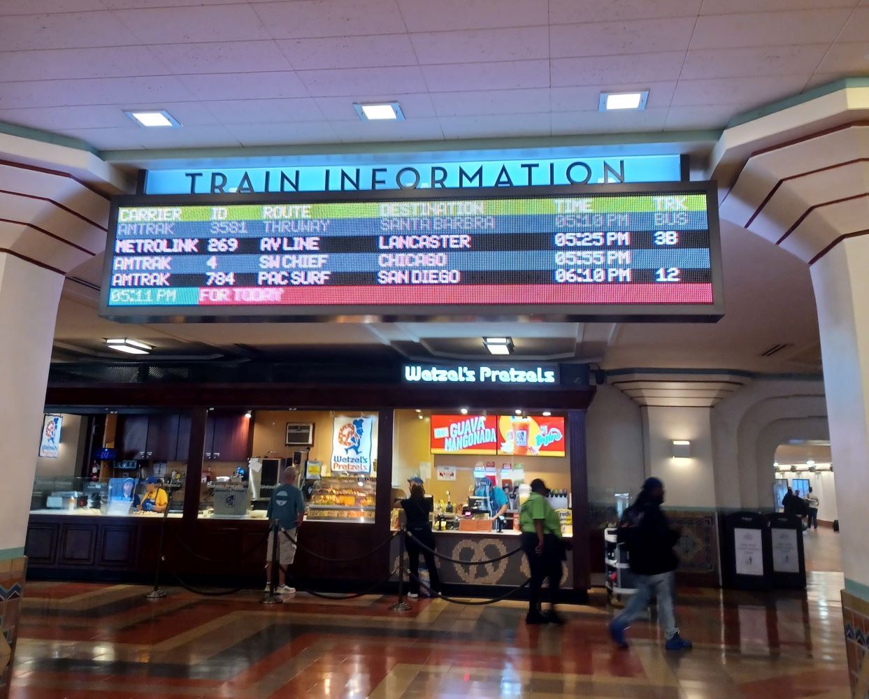待合エリアで待つこと数時間、サウスウェスト・チーフ号の発車時刻の2時間前になりようやく電光掲示板に列車名が載るようになりました。アムトラックの大きな駅では乗車時間になるまでどのプラットホームの番線に列車が入線するかアナウンスが無いので、乗客は待合室エリアで待ちます。駅員さんに「発車時間の15分前に乗車案内のアナウンスがある」と教えてもらい、待合エリアで座っていましたが、なかなか番線の表示がでません。そのうちに30分、そして1時間の遅延とアナウンスされました。アムトラックの遅延は珍しいことでは無いのですが、ほかの列車はほぼ時刻通りに出発していて、どうやらサウスウェスト・チーフ号だけの問題が発生しているようでした。