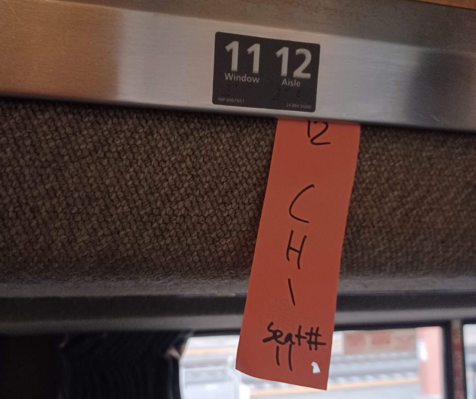 普通車(コーチクラス)の座席は、予約時には指定されませんが、サウスウェスト・チーフ号などのような長距離路線では駅の窓口で当日の出発前に座席の指定(手書きの座席番号)を受けます。これも一回だけ館内放送があったので、聞き逃さないように気を付けなければなりません。