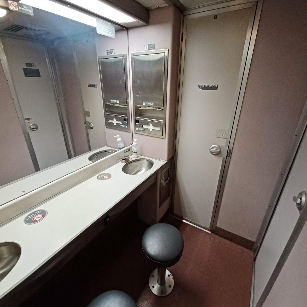 サウスウェスト・チーフ号の普通車は二階建てひと車両につき1階の半分と2階のフロア全部が座席エリア、1階の半分に共用の手洗いが5つと、荷物置き場があります。手洗いの一つはまずドアを開けると二つの洗面台があるラウンジになっていて、その横にトイレがあります。この構造は今回連結されていた2両の普通車ともに同じでした。