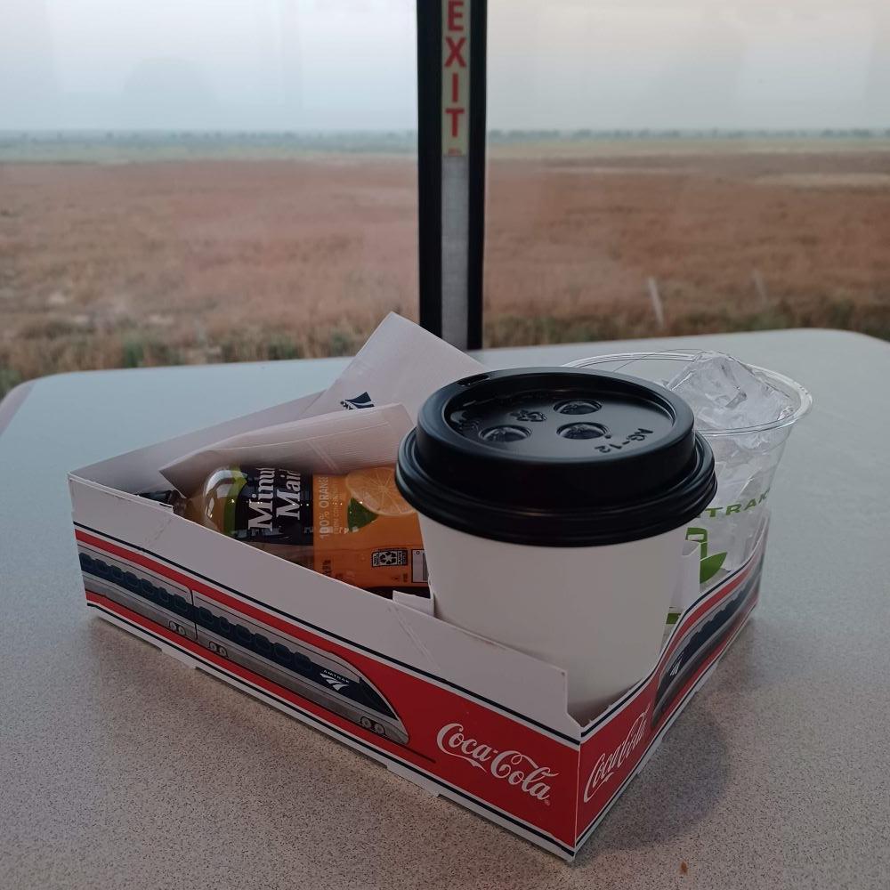 普通車両の隣が展望車両で、2階が展望デッキ、1階がカフェラウンジになっています。カフェでは朝昼晩一定の時間帯になるとテイクアウト専門の軽食を販売し、席に持ち帰ったり、展望デッキやカフェ横の飲食コーナーでも食べることができます。(現金、カードいずれも支払いOKでした)