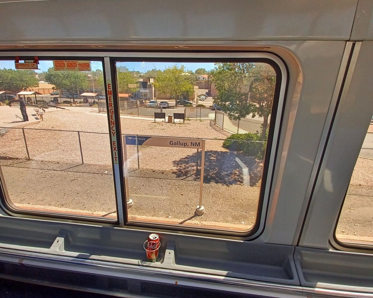 アリゾナ州内から大幅な遅延が発生してしまいましたが、このあたりからニューメキシコ州サウスウェスト・チーフ号のルートはかつての大陸横断の重要な幹線道路として有名な「ルート66(旧国道66号線)」と同じ地域を通るので、駅周辺にもレトロな雰囲気の看板や赤茶色の建物がフラッグシップ駅からアルバカーキ駅エリアで見られました。車内アナウンスでも車窓からの見どころがあると教えてくれます。
