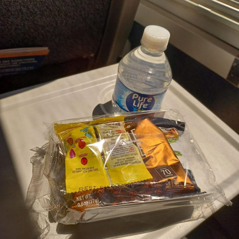 アムトラックの携帯アプリでは乗車中の列車の運行状況が確認できたので、予定時間と実際どれくらい運行時間の違いが発生しているかを随時見ることができます。遅延が長くなるにつれ、本来普通車乗客にサービスされない、水とスナックの差し入れがありました。列車の遅延によるアムトラックの対応について、このあとさらにいろいろ知ることとなりました。