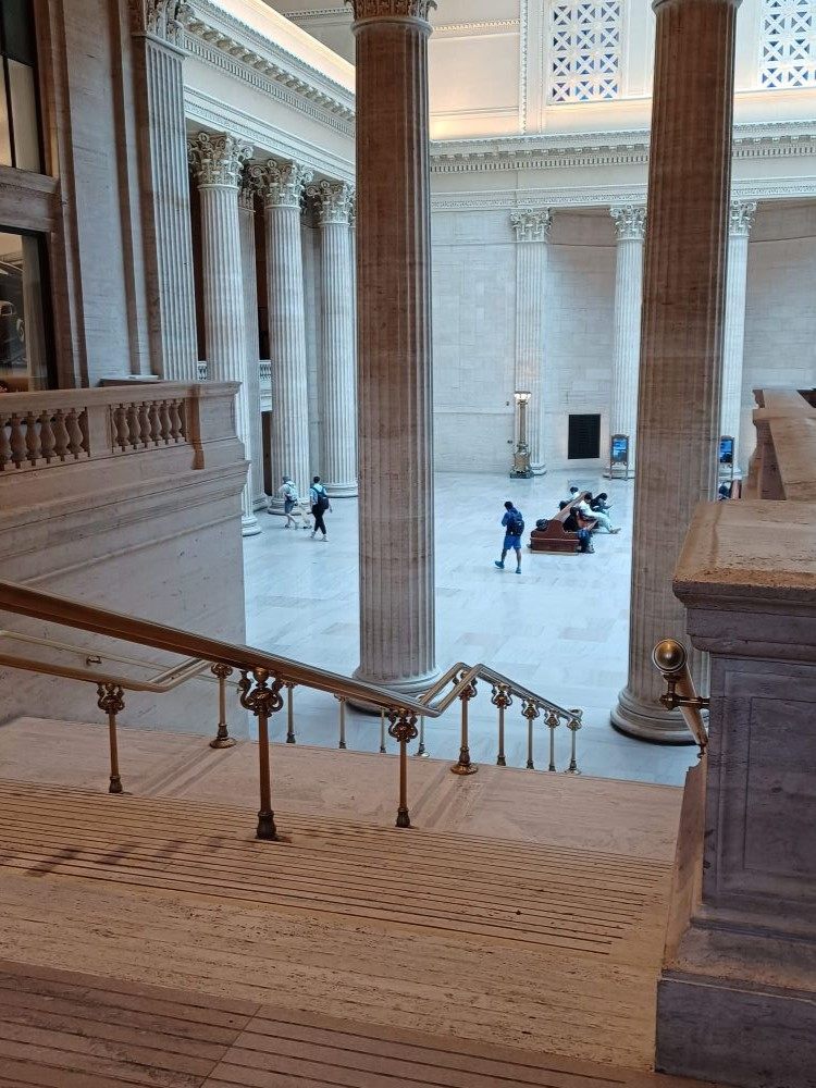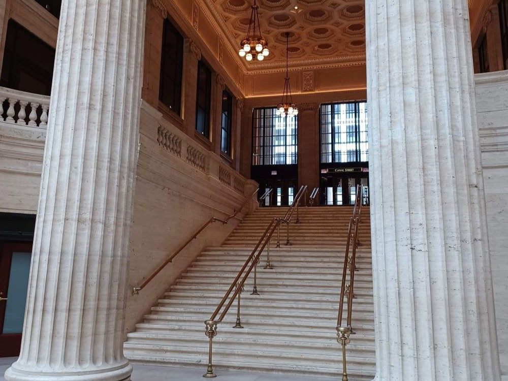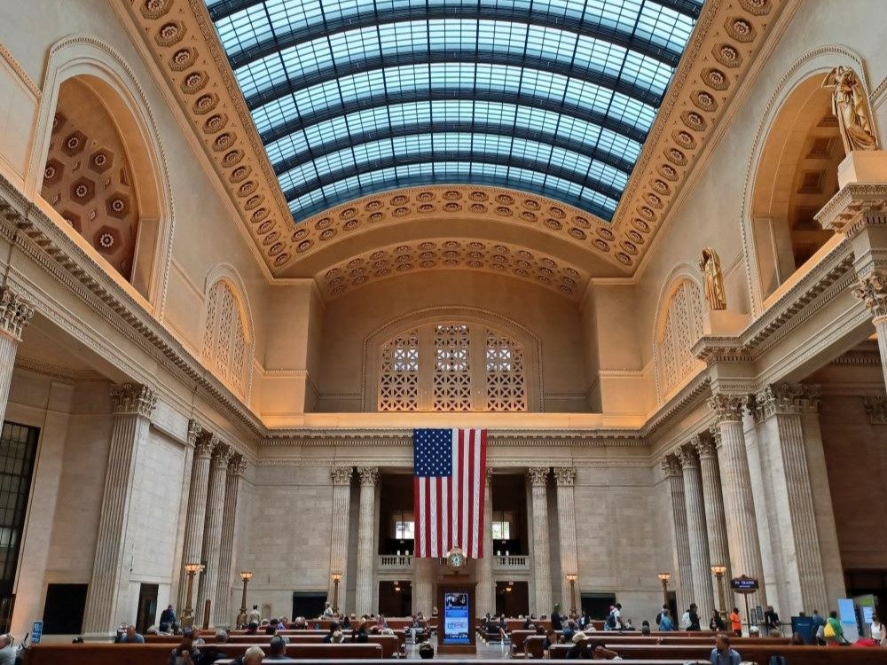 シカゴ・ユニオン駅(ユニオン・ステーション)はアムトラックで最も主要な駅で、多くの長距離路線の乗換駅となっています。ちなみにユニオン・ステーションという名称は複数の鉄道会社が乗り入れている駅という意味であるため、アメリカ国内にはLA、ワシントンDCなど<ユニオン・ステーション>と名付けられた駅がたくさんあります。ターミナル駅だけに駅舎もレトロな豪華さで、特に待合エリアのホールには大理石の大階段が二か所あり、その一つは映画「アンタッチャブル」(1987年)の重要なシーンで有名です。LAのユニオン駅よりはシカゴのユニオン駅の方がフードコートも充実しており、待合エリアも広いです。またアムトラックの寝台車利用の乗客であれば、アムトラックの専用ラウンジを利用することもできます。発着案内の方法も基本はLAの時と同じく、乗車案内が始まるまでプラットフォームへ行くことは出来ず、待合エリアかラウンジで待ちます。