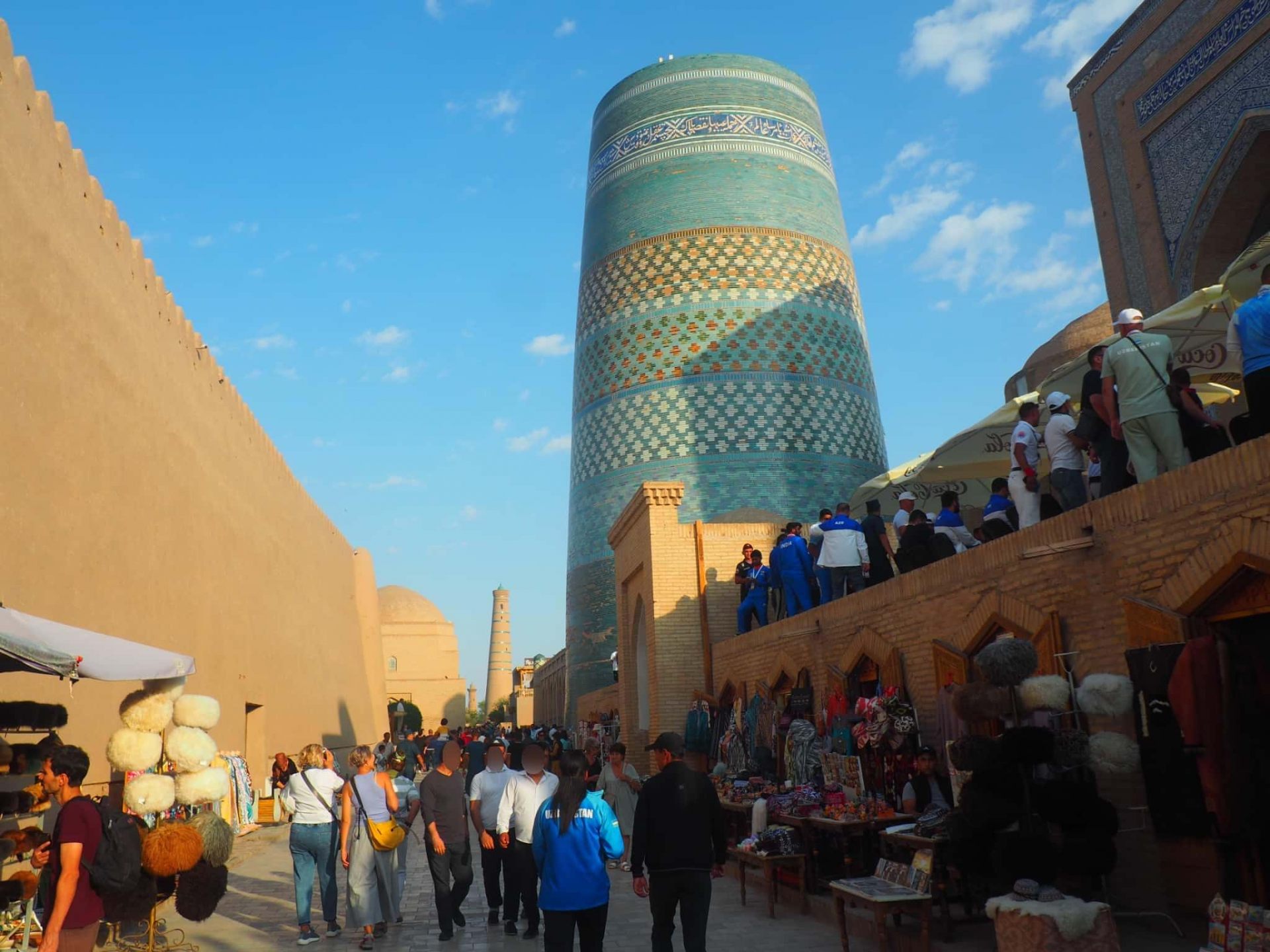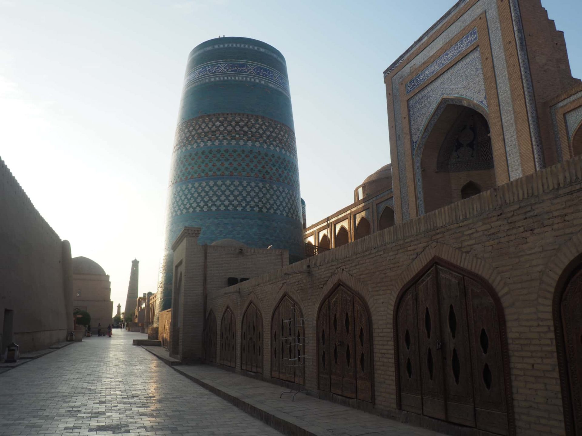 見どころはパルヴァン・ダルヴァザとオタ・ダルヴァザを結ぶ東西のメインストリート、パルヴァン・コリ通りとその周囲に集中しています。オタ・ダルヴァザから入ると、すぐ右手に見えるのがヒヴァのシンボルのカルタ・ミノル。1852年に着工したミナレットで、本来ならヒヴァで最も高い塔になるはずだったものの途中で工事が中断してしまい、真っ二つにスパッと切られたような形になってしまいました。