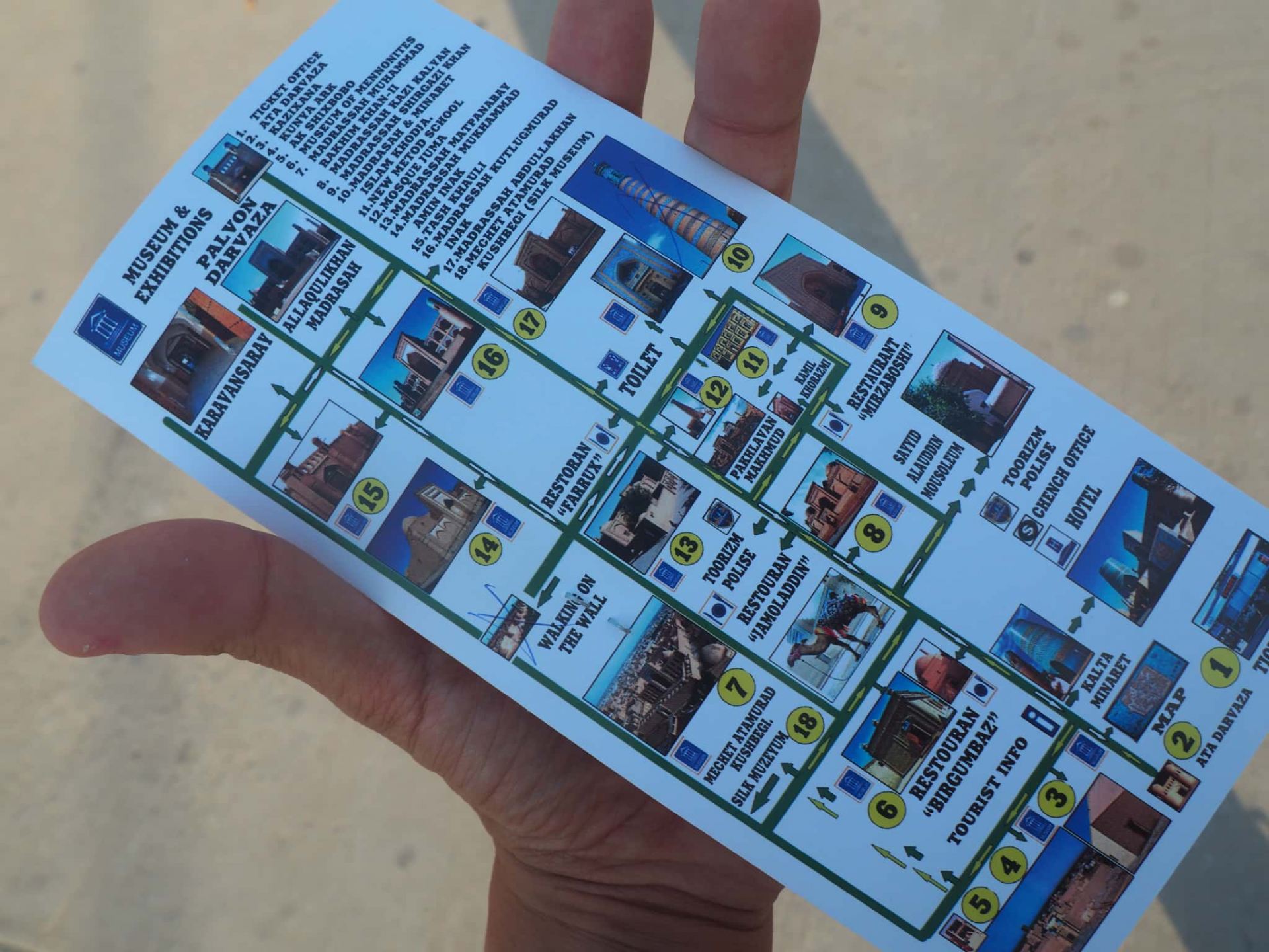 ヒヴァでは観光地に入るのに毎度毎度チケットを買う必要はありません。まずパルヴァン・ダルヴァザ内のチケット窓口か、オタ・ダルヴァザ(西門)出口近くにある窓口で共通入場券を購入。以前はイチャン・カラに入るだけでも料金が発生し、入場のみ有効なエコノミー券と、建築物に入場可能な普通券・VIP券の3種類のチケットがあったそうですが、現在は15万スムの共通入場券しか販売しておらず(ウズベキスタン在住者はアクレディテーションカードの提示で半額に)、これがあれば一部を除いてだいたいの見どころに入ることができます。またイチャン・カラ自体には無料で入れるようになっており、パルヴァン・ダルヴァザとオタ・ダルヴァザの他バフチャ・ダルヴァザ(北門)とタシュ・ダルヴァザ(南門)といった入口もあります。