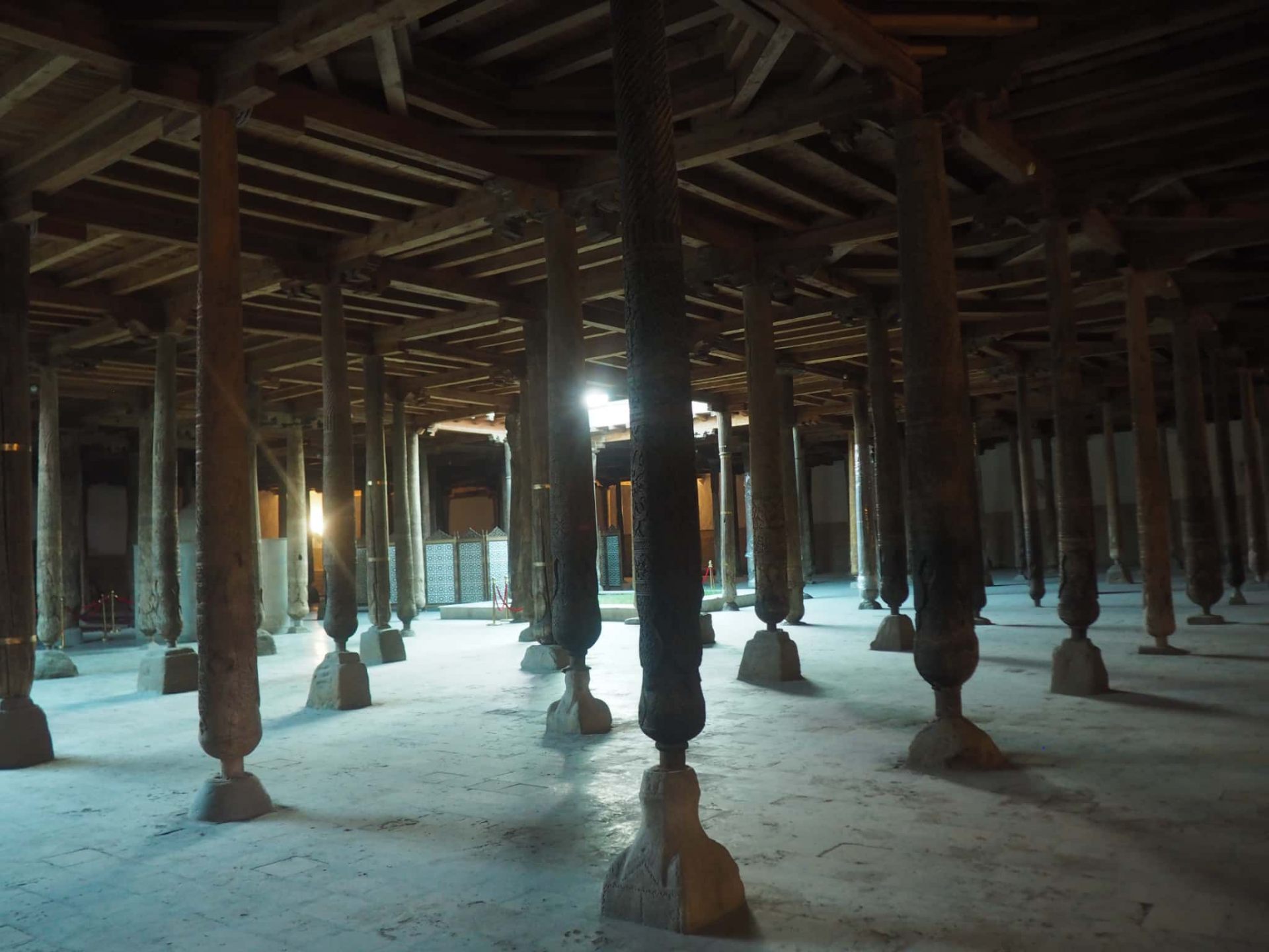 パルヴァン・コリ通りへ戻り、左右に建ち並ぶメドレセを見ながら、高さ42mのミナレットが目印のジュマ・モスクへ。ここの目玉は、何といってもモスク内部に立つ213本の木の柱。他のモスクではなかなか見られない珍しい構造で、まるで鬱蒼とした森林のような独特の雰囲気を醸し出しています。