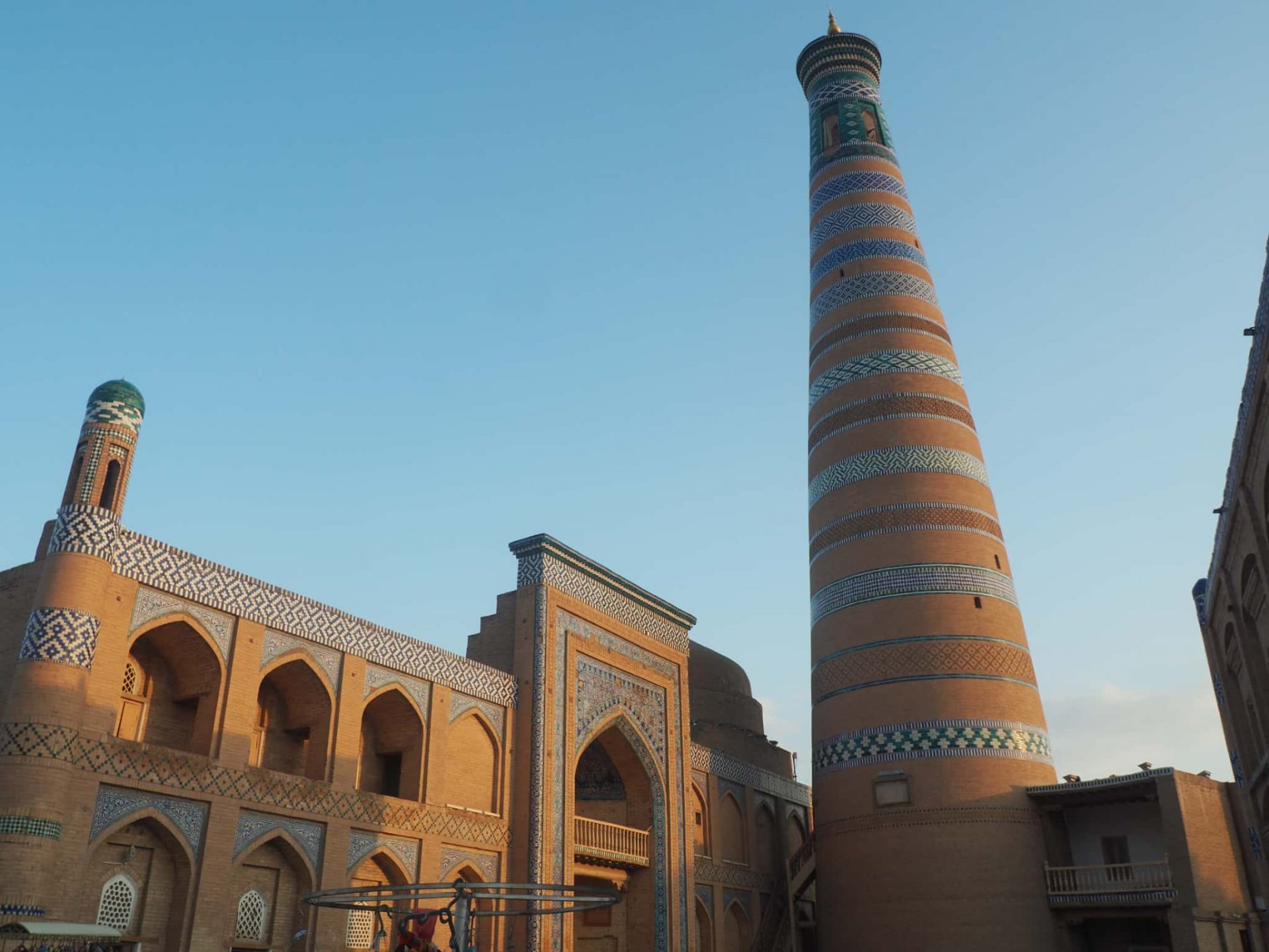 このミナレットは頂上まで上ることができますが、こちらも共通入場券のほか10万スムの追加入場料が必要。118段ある階段は一段一段が急で、頂上に着くころには疲労困憊になってしまうかもしれません。しかしここからの眺めはヒヴァ観光のハイライトといえるほど見事なもので、イチャン・カラはもちろん、遠くトルクメニスタン国境方面までもが見渡せます。かつてこの町が栄えていた頃は、あの砂漠の向こうからキャラバンたちがどんどんやって来たのだ…と思いを馳せてみるのもいいかもしれません。