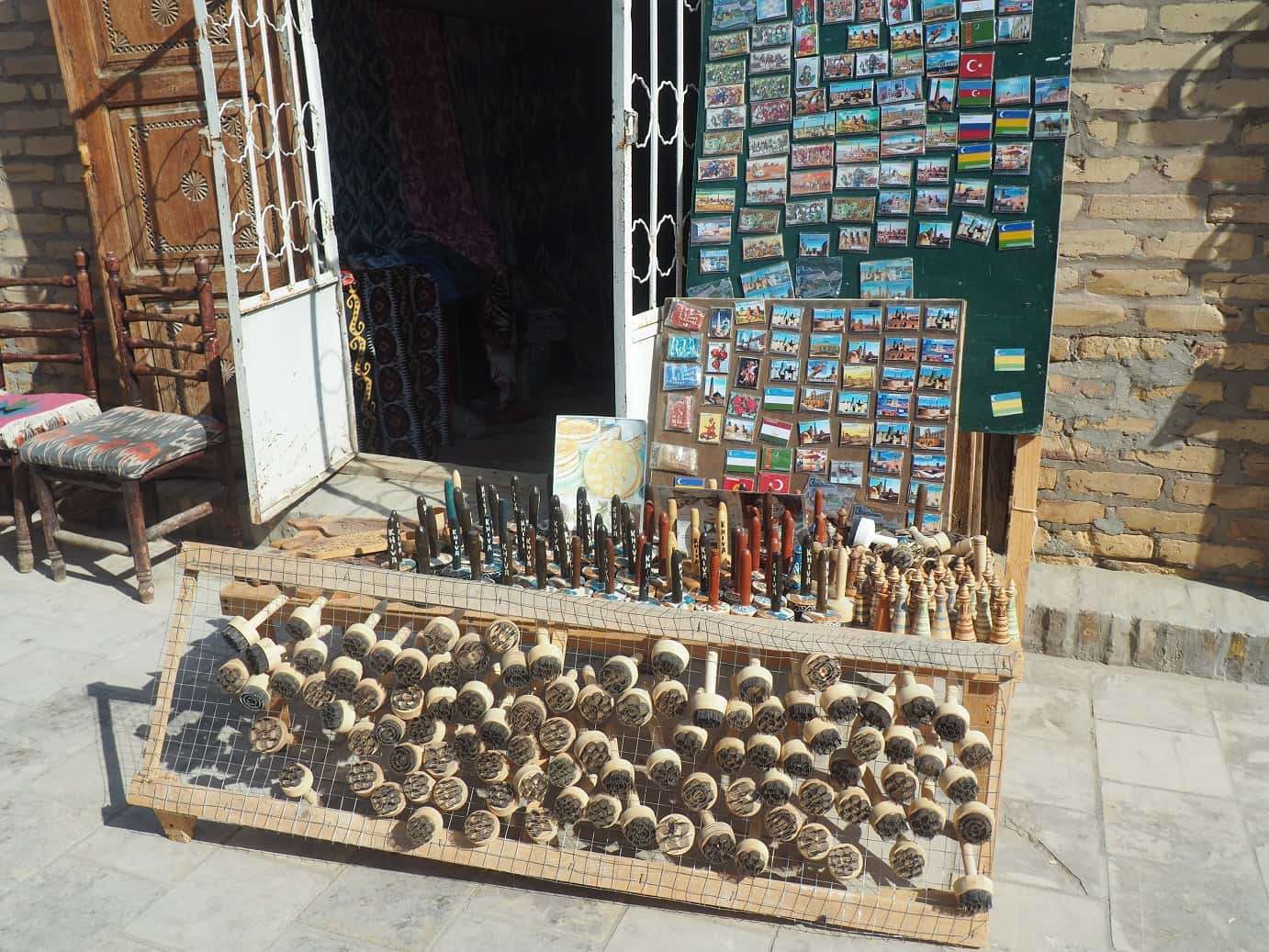 柱は1本1本緻密な彫刻が施されているので、ぜひ観察してみてください。最も古い柱は10~11世紀に彫られたとのこと。この木彫り細工こそがヒヴァの伝統工芸で、現在でもお土産屋さんではよく木工製品が売られています。なぜ砂漠の町のヒヴァで木彫り細工が発達したのか?とサマルカンドで働く知人の木彫り職人に聞いてみたところ、かつてヒヴァの近くでは木彫り製品の原料となるニレの木がよく取れていたとのこと。現在この木はあまり取れなくなってしまったそうですが、それでも多くの木彫り職人が今もヒヴァで活躍しているそうです。