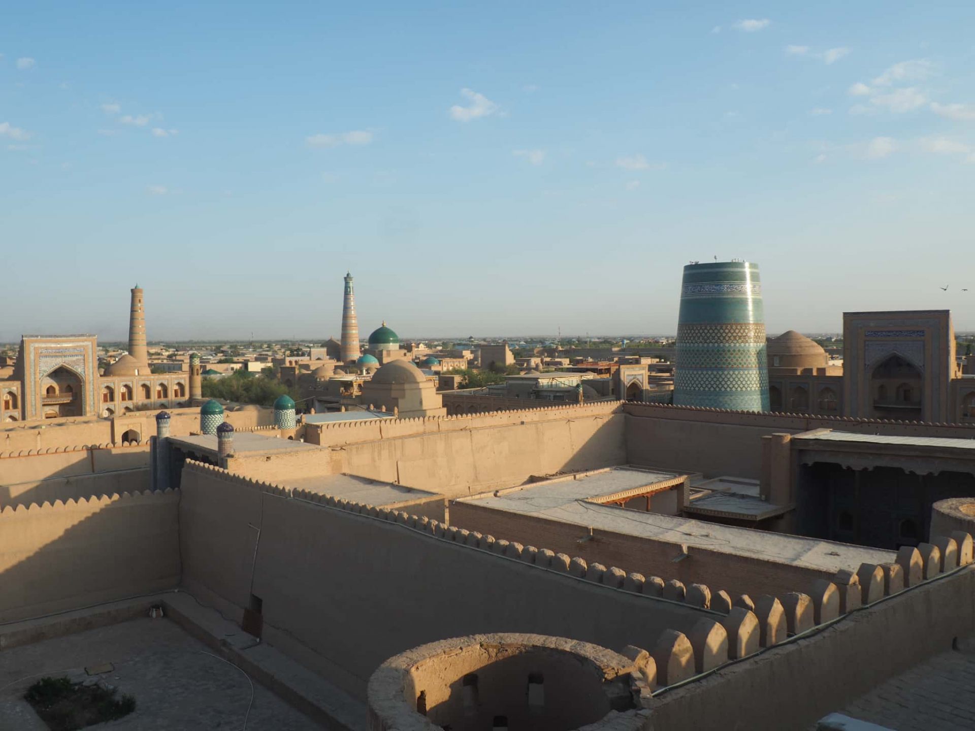 このクフナ・アルクでの一番の必見スポットは、急な階段を登るとたどり着くアクシェイフ・ババの見張り台。イチャン・カラ全体が収まる絶景が眼下に広がります。カルタ・ミノル、ジュマ・モスクのミナレットとイスラーム・ホジャ・ミナレットと3本のミナレットが立っている眺めは、ヒヴァへ来た!という実感が一気に湧いてくる大パノラマです。