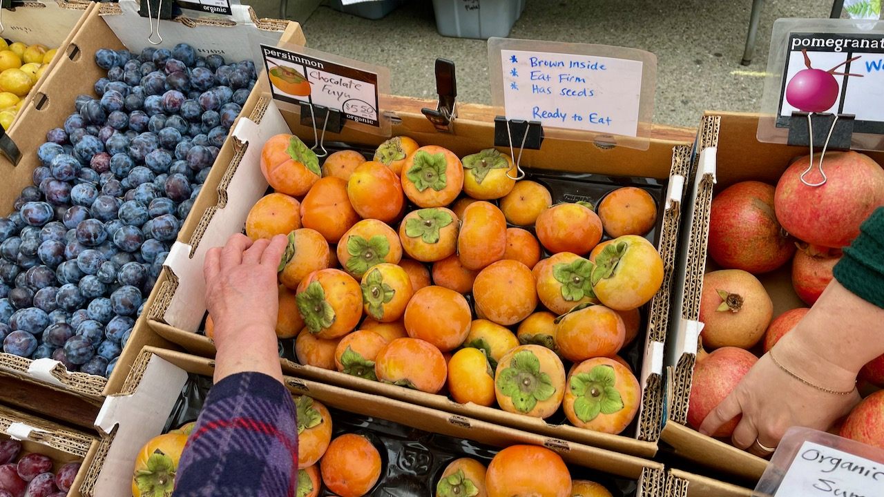 中身がチョコレート色なので”チョコレート富有柿” デザートにぴったりのネーミングです。大きさにもよりますが、2〜3個で$5.50・‥まぁそれなりに高級品種です。日本のばぁちゃん家の裏庭にあった柿の木を思うとどうも高級品に思えてしまう・‥(苦笑)