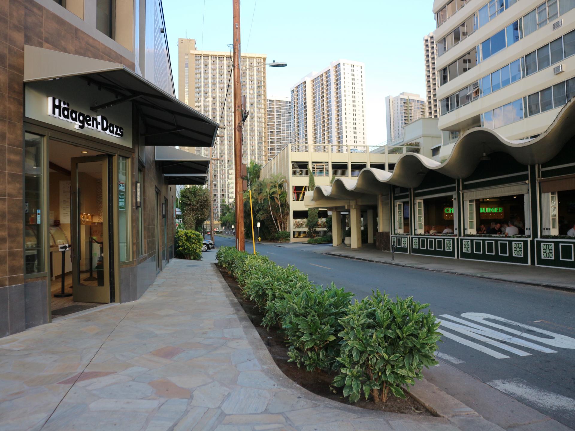 場所はアロヒラニ リゾート ワイキキ ビーチの裏側。正面玄関の裏側なので、ダイヤモンドヘッド側になります。と言っても、わかりにくいのですが、ダイヤモンドヘッドに向かってカラカウア通りを歩いて、ケアロヒラニ・アベニューを左折します。