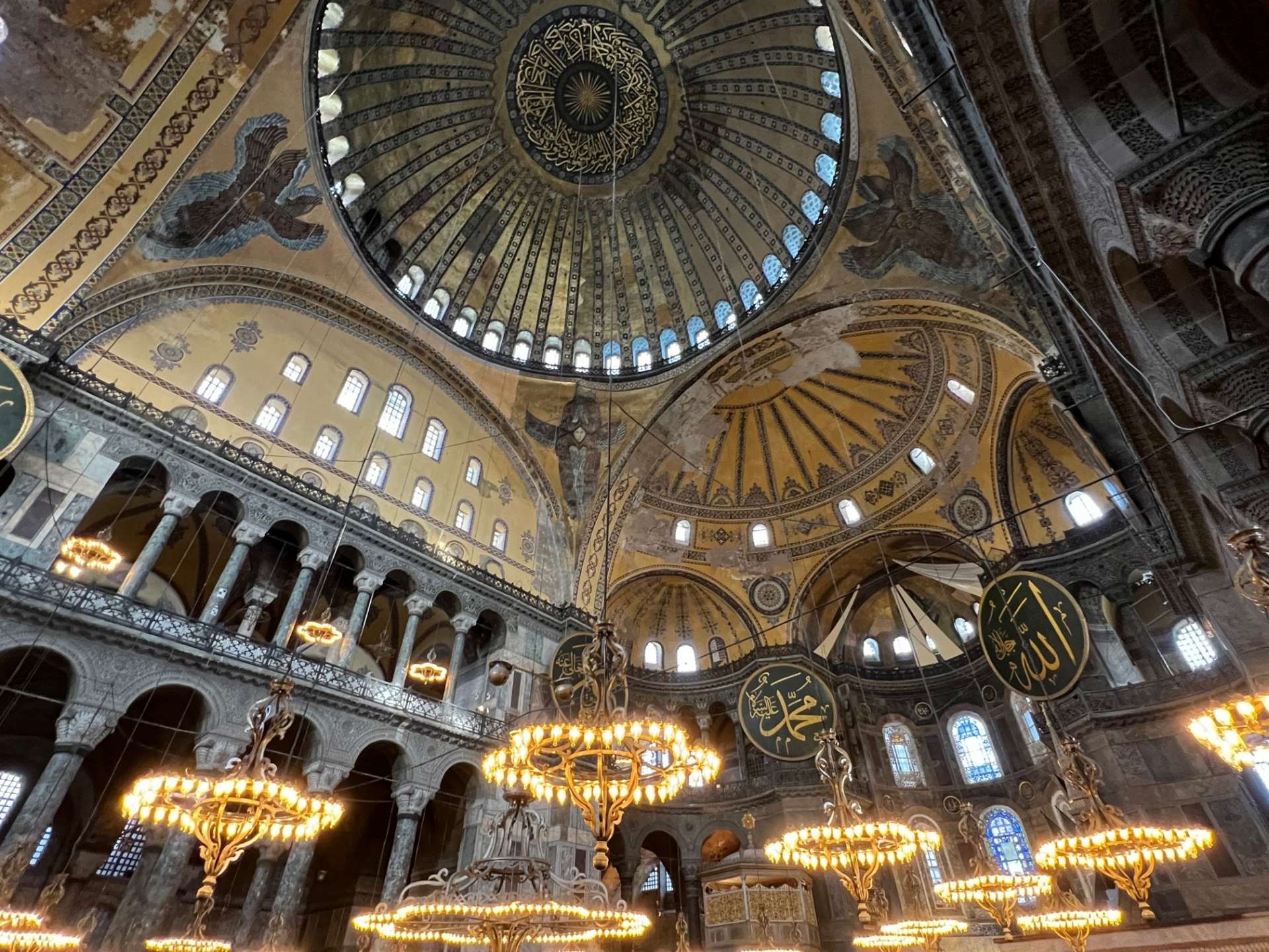 元々537年に東ローマ帝国により完成された教会です。その歴史の中でもイスラム征服後はモスク、十字軍制圧で教会に戻り、再びモスクになるなど、イスタンブールの街とともに歴史の変遷をたどっています。2020年からモスクとなっています(1935年以降は最近までミュージアムでした)。建物のドームの構造は教会建築を思い起こさせ、入口付近の天井にはキリスト教時代の聖母子画などが残っているものの、アラビア語のイスラム教のパネルや電灯などの装飾が施されていてモスクとなっている、その文化の交錯を体感できるのが素晴らしいです。