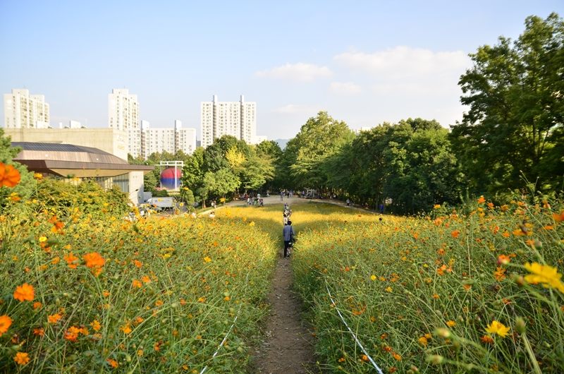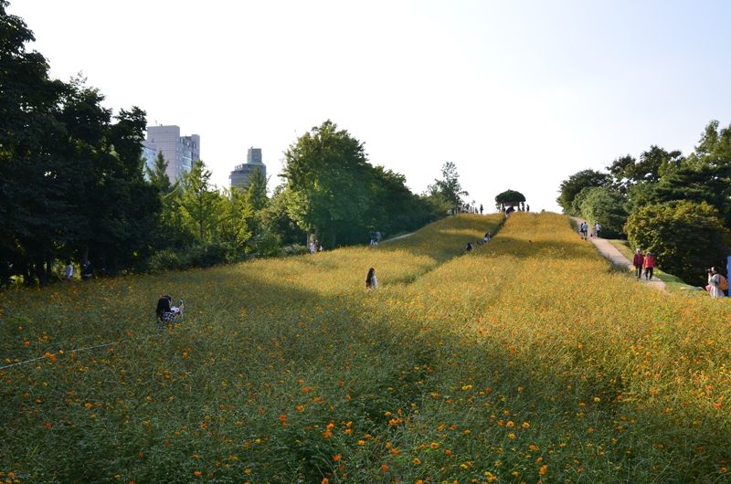 10月の1週目ぐらいまで見られる黄花コスモス畑のオリンピック公園ドゥルコッマル。オリンピック公園自体、非常に広く、じっくり周ると数時間はかかるので、お散歩がてら、ぜひ訪れてみてください。