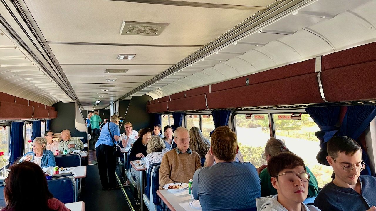長距離列車の楽しみの一つがダイニングカーでの食事ですね。スナックバーにはカップ麺とかデニッシュが販売されておりそれで済ましてしまう人もいましたが、今や消えつつある列車のダイニングカー。ランチ25ドル(飲み物付き)、ディナー45ドル(飲み物付き)で決してお高い料金ではないのでここはぜひ体験してほしいところです。