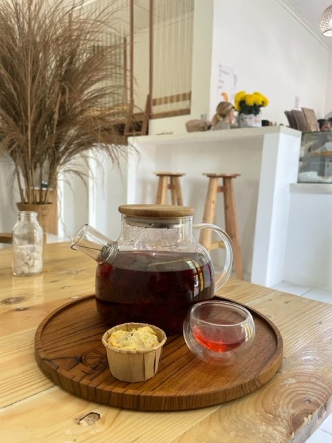 コーヒーとティー、デニッシュ類、ホームメイドのシンプルな味付けのマフィン、ビスケット(スコーン風)、チーズケーキなど、日替わりでスィーツも変化。