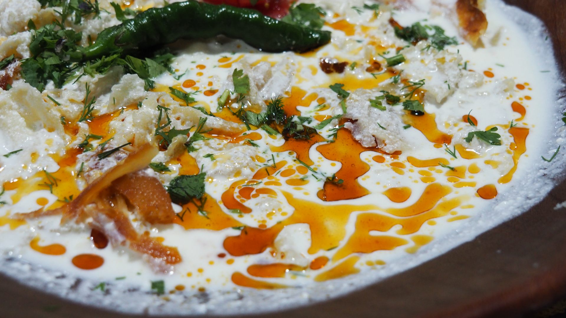 クルトップはタジキスタン固有の伝統料理で「クルト」と呼ばれる乾燥したチーズのような乳製品の塊と、これまた独特のパンを温水に浸したものに、様々なトッピングを振りかけることで作られます。使用される材料の特徴から、英語では「Bread Salad」等と形容されることもありますが、実際は前菜というよりも強烈な量と密度を持つ主食級の料理です。