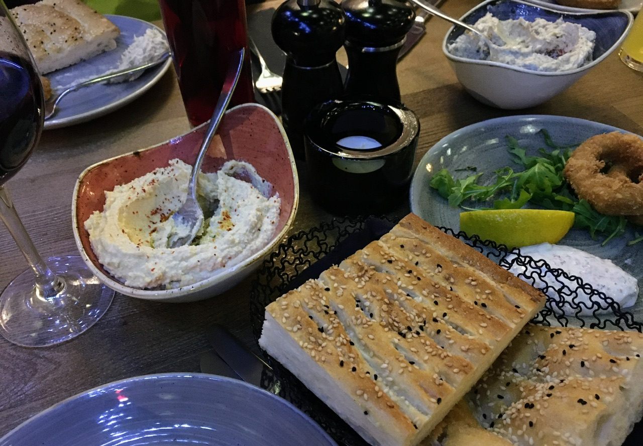 辞書を引いてみると、「オードブル、前菜◆ギリシャ・トルコ・中近東の料理の一種で冷菜・温菜の盛り合わせ」などとあり、スペイン料理のタパスのようなものかもしれません。種類を増やせば増やすほどお得になるシステムだったので、豆ペーストのフムスにこれまた似た感じのナス入りディップ(babagannoush)とイカリングのフライ、カラマリを選択。3種類で£17.5です。