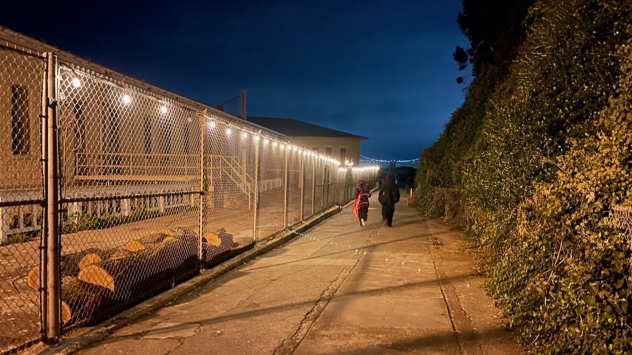 船上の諸注意は通常のツアーと全く同じです。15分でアルカトラズ島の桟橋に接岸。広場には、鮮やか羽の民族衣装や帽子を被った人たちが部族の旗や垂れ幕を持って坂道を上って行くのでそれについつい従い。 パークレンジャーが危険な立ち入り禁止区域や閉鎖中の箇所に待機して、セレモニーが行われるパレード広場に誘導しています。街灯はありますが少し外れると本当に真っ暗で怖かったです。