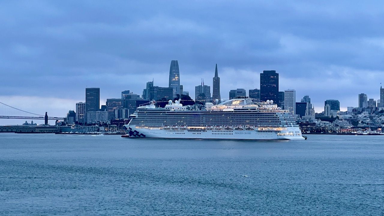 7:00にゴールデンゲート海峡を通過した豪華客船が静かにピア27に向かっています。タグボートが小さく見えますね。