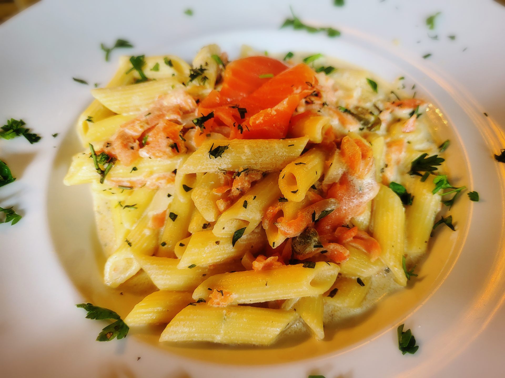 私が注文したパスタは、「Général De Gaulle(ジェネラル・ド・ゴール)」というメニューで、ペンネにスモークサーモンが入ったクリーム系のパスタです。