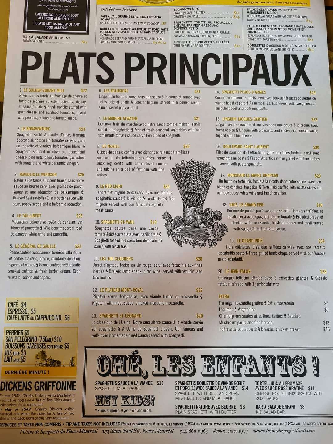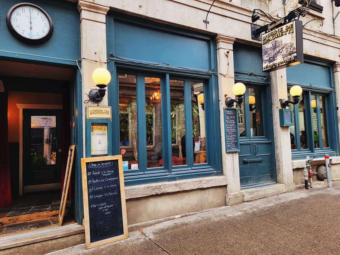 今日ご案内するレストランは、旧市街の中心でもあるジャック・カルティエ広場から徒歩1分のイタリアンレストランで、その名も「L'Usine de spaghetti(ユジーン・ドゥ・スパゲッティ=スパゲッティー・ファクトリー)」。