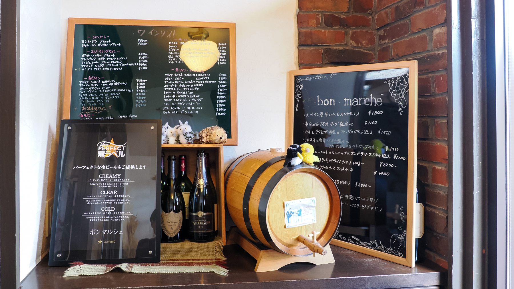 白樺の幹が目印の「ボン・マルシェ」は、ペチカを思わせるエントランスの壁や落ち着いた色のドアが印象的なレストランです。
