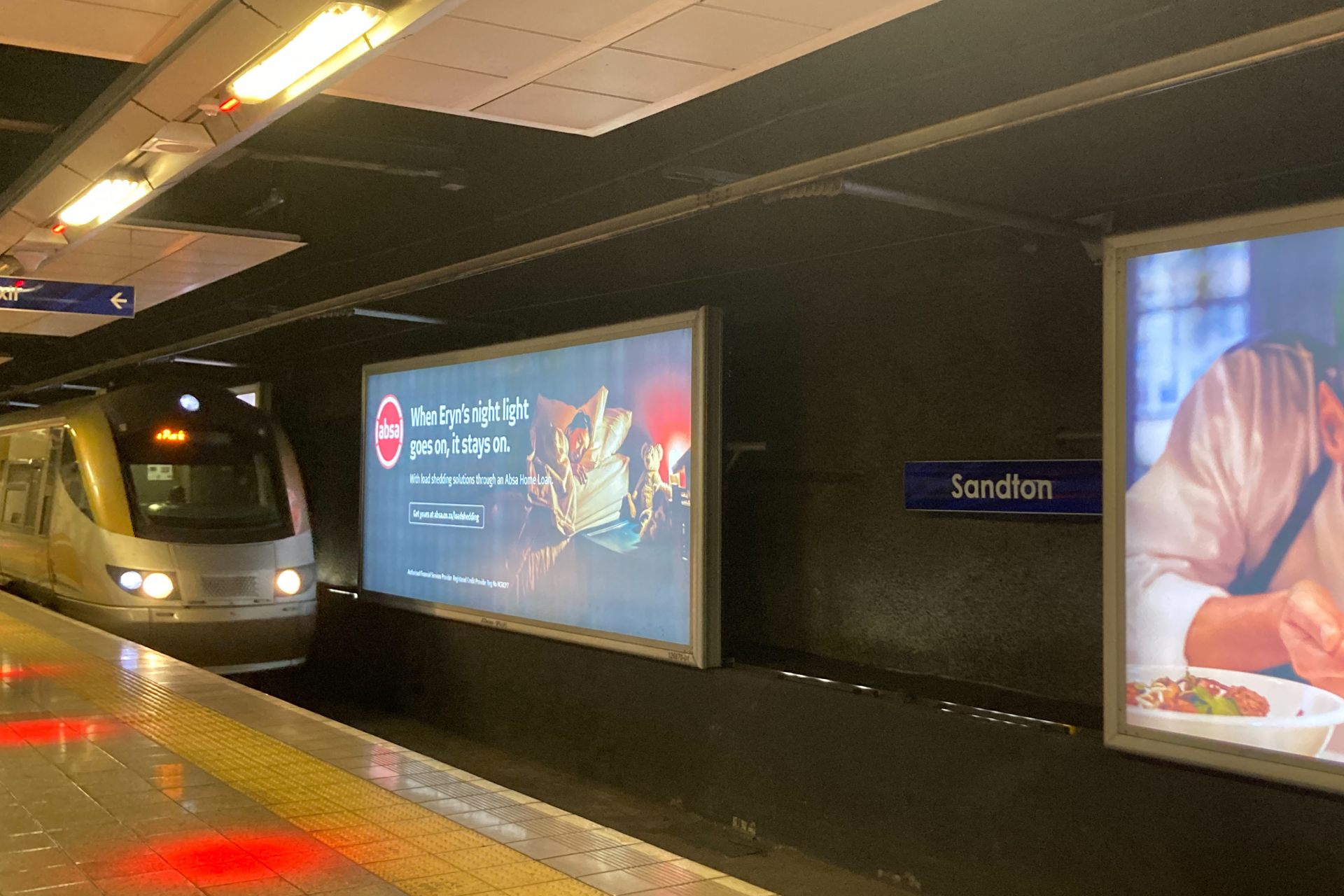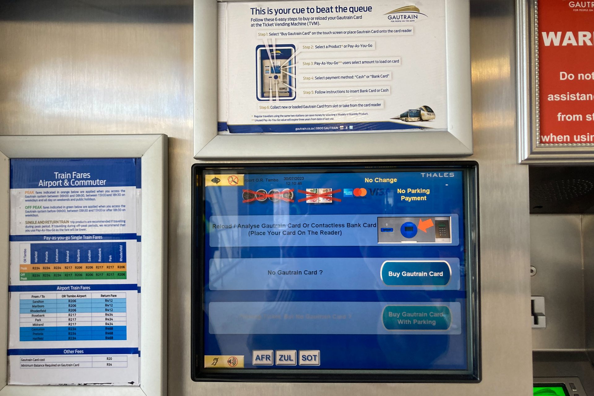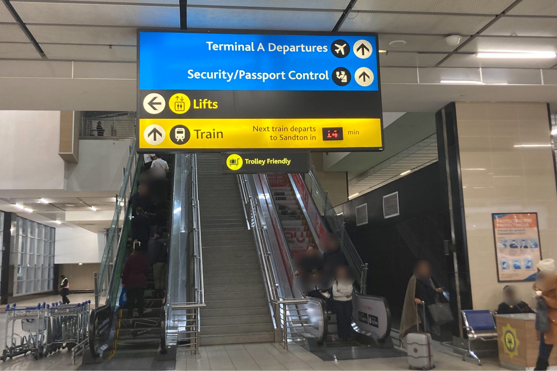 ヨハネスブルグ国際空港に到着したらTrainの看板を探してください。