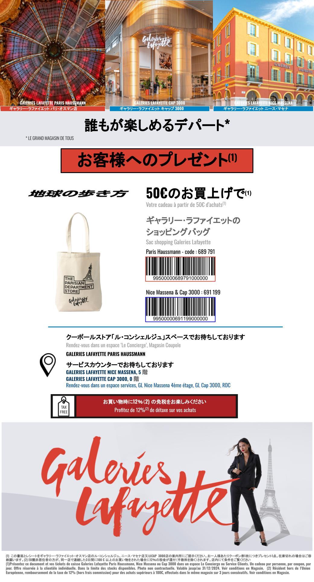ショッピング額に応じて、その場でもれなくもらえるギャラリー・ラファイエットと地球の歩き方がコラボレーションしたクーポンが、南仏ニースおよびその近郊にあるギャラリー・ラファイエットの2店舗でも使えるようになりました。