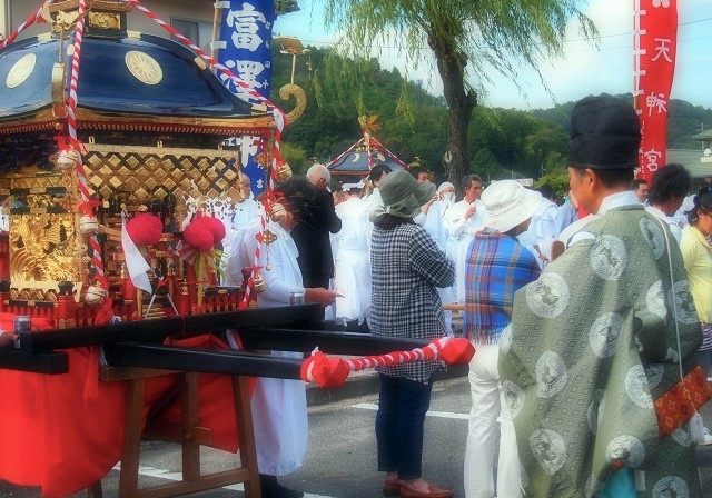 建部町内の多自枯鴨神社・佐久良神社・富沢神社・宮地神社・真名井神社・天神宮・天満天神宮の七社から神輿が氏子の家を廻りながら麓の八幡温泉に参集し、七社八幡宮の神輿を含め、八社の御輿が集まってから来るとのことでした。