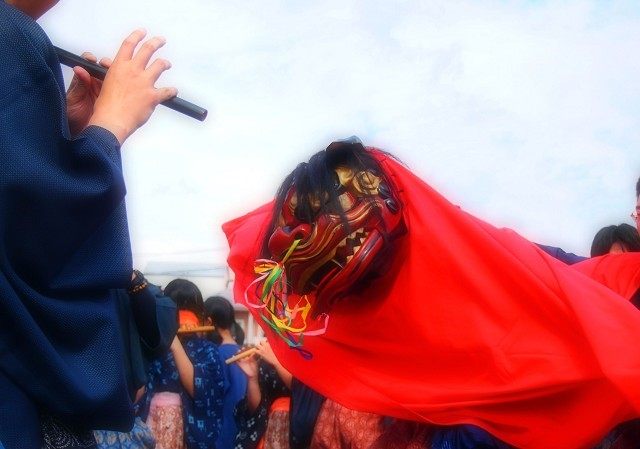 詔の後には神楽(獅子舞)です。各地に保存会があり、舞型も複数あるようでした。舞いの周りには笛や太鼓の囃子方が取り囲んでいます。また、鬼の装束をまとった棒遣いも繰り広げられています。